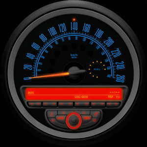 黒盤面+ブルー発光に、純正指針・オーディオイルミネーションのアンバーが、